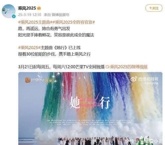 节目组官博发布《她行》主题曲的同时还透露了播出信息:“跟着30位姐姐的步伐,携手踏上乘风之行。3月21日起每周五、每周六12:00芒果TV全网独播。”这30位姐姐的阵容也是相当强大,叶童、吴宣仪、王珞丹、祝绪丹、彭小苒、罗予彤、李艺彤、黄英、侯佩岑、李晟、倪虹洁、卡琳娜、陈德容、蒋梦婕、邓萃雯、何泓姗、曹颖、李嘉琦、宋妍霏、江一燕、蒋一侨、张小婉、王蓉、管乐、VaVa、马吟吟、谭薇、刘禹彤、努恩Nune、房琪,这些来自不同领域、有着不同风格的女星齐聚一堂,让观众们对节目充满了期待。